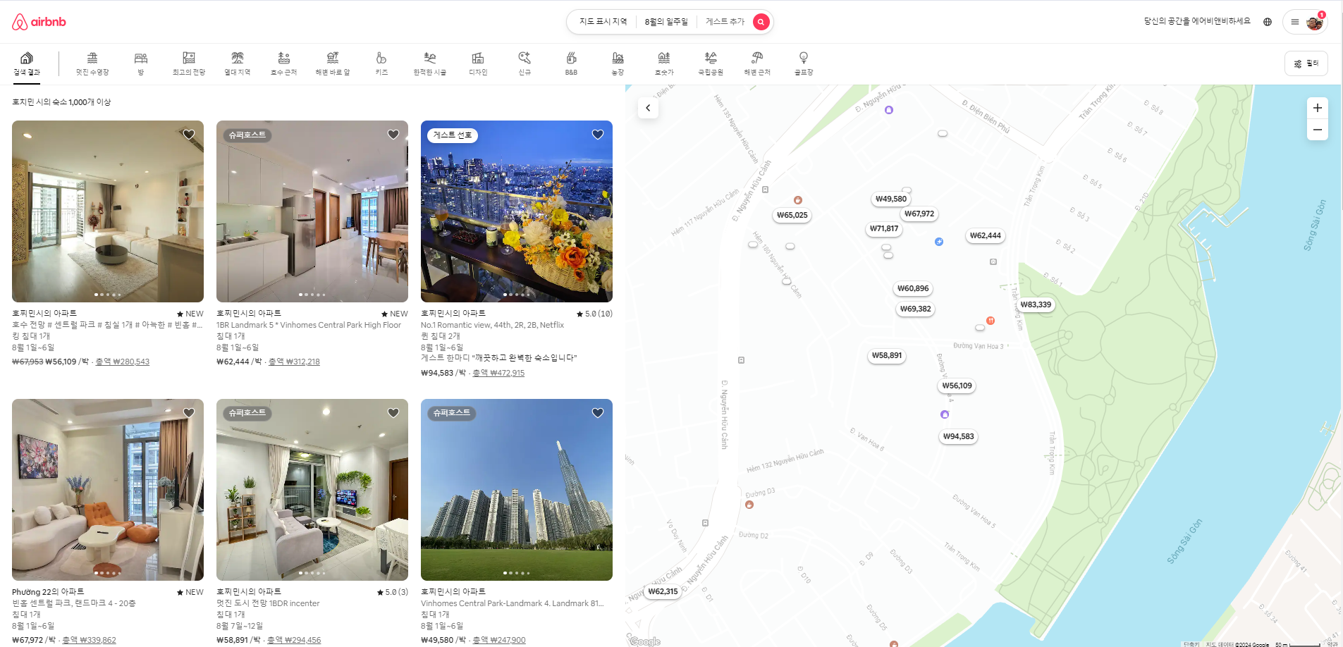 호치민에서 아파트를 빌리는 경우 가장 많이 빌리는 아파트가 빈홈 센트럴파크일 것이다. 에어비앤비 지도를 보면 빈홈 센트럴파크에서 굉장히 많은 아파트들이 조회되는 것을 볼 수 있다. 빈홈센트럴파크에는 한국사람들도 많이 살고, 한국 사람들이 많이 단기 스테이한다. 호치민에서 에어비앤비하면 제일 많이 묵는 곳이 빈홈센트럴파크이다.